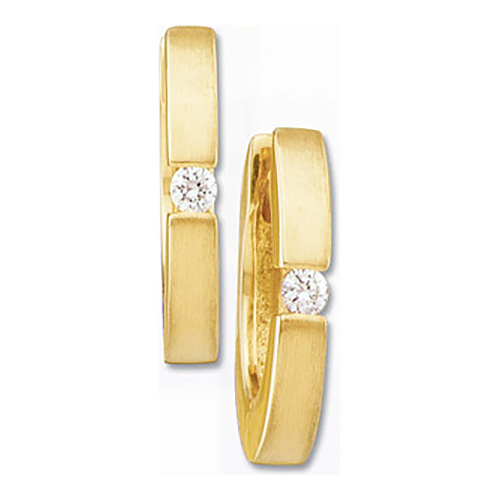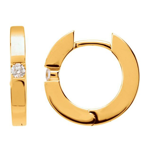 This pair of gorgeous hinged 14kt yellow gold diamond accented earrings are 14.25 MM and weigh 3.70 grams. Diamond details: 2 x .035CT, Clarity SI1, Color G-H round Diamons; .07 CT TW.
