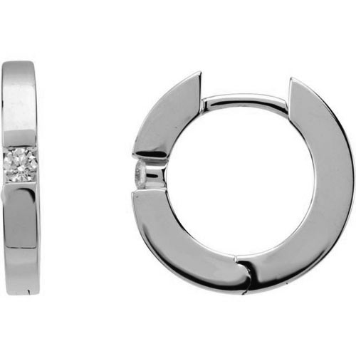This pair of 14k white gold diamond accented round hoop earrings are 14.25mm in diameter, smaller than a dime. Two genuine round full-cut diamonds, .07 carat total weight, clarity SI1, color G-H. Crafted from high-quality white gold, these small round hoop earrings are designed to complement any outfit, adding a touch of luxury to your everyday style. Each earring is adorned with a single, dazzling diamond, adding just the right amount of sparkle to your look. Whether you're dressing up for a special occasion or simply adding a touch of glamour to your everyday look, these earrings are a must-have addition to your jewelry collection.