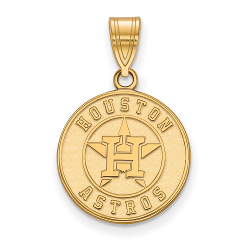 This small round Houston Astros logo pendant is made of polished 14k yellow gold. Item size: 16mm x 15mm. Officially licensed MLB jewelry. Weight: 1.7 grams. Made in the USA. Fits up to a 4mm chain.