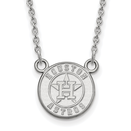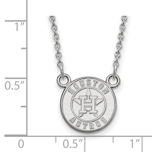 This round very small Houston Astros logo pendant necklace is made of polished 14k white gold. Pendant size: 12mm x 12mm. Pendant is smaller than a dime. 14k white gold 18in cable chain with lobster clasp. Chain width: 1.95mm. Officially licensed MLB jewelry. Weight: 1.3 grams. Made in the USA.