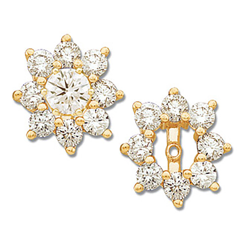 Each jacket accommodates up to a 3/4 CT TW diamond center. This classic pair of 14kt yellow gold diamond earring jackets are accented with 16 .07 CT - 02.70 MM full cut I1 round faceted GHI genuine diamonds. Diamond clarity I1, color G-H. These jackets weigh 1.44 DWT (2.70 grams).
