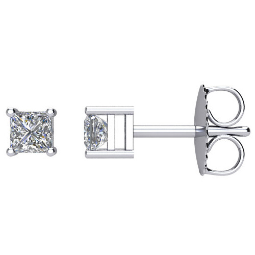 This classic pair of 14kt white gold princess 1/4 CT TW diamond stud earrings have two 03.00 MM, I1 square princess GHI genuine diamonds. These earrings weigh 0.53 DWT (0.82 grams).