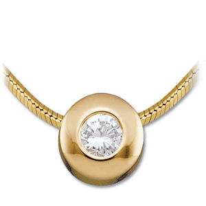 Necklace features one bezel set 1/10 CT [3.0mm] full cut round diamond. Diamond clarity I1, color G. Includes 14k yellow gold 18-inch diamond cut snake chain. This item weighs 2.59 DWT (4.03 grams).