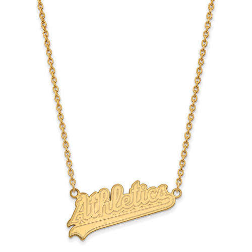 Oakland A's script pendant necklace is made of polished 14k yellow gold. Pendant size: 5/8in x 1/2in. 14k yellow gold 18in cable chain with lobster clasp. Chain width: 1.95mm. Officially licensed MLB jewelry. Weight: 3.6 grams. Made in the USA.