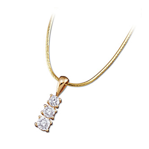 This elegant 14kt yellow gold three stone 3/4 carat total weight diamond slide pendant dangles from a 14kt yellow gold 18in snake chain. Available while supplies last. Diamond details: one .33 Ct - 04.40 MM full cut I1 round faceted GHI diamond, one .25 Ct - 04.10 MM full cut I1 round faceted GHI diamond and one .20 Ct - 03.80 MM full cut I1 round faceted GHI diamond. This item weighs 6.48 grams.