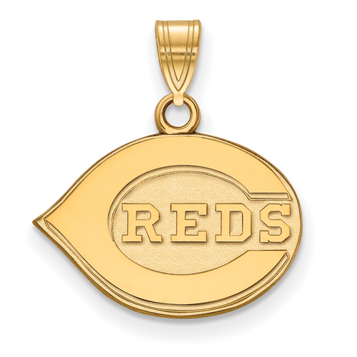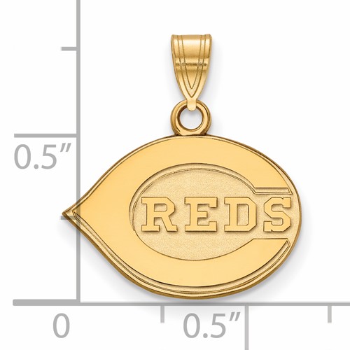 This Cincinnati Reds wishbone logo pendant is made of polished 14k yellow gold. Item size: 1/2in x 3/4in. Officially licensed MLB jewelry. Weight: 1.6 grams. Made in the USA. Fits up to a 3mm chain.