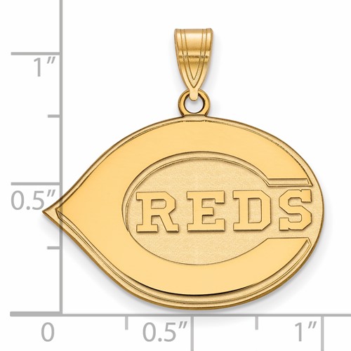 The Cincinnati Reds logo pendant is made of polished 10k yellow gold. Item size: 1in x 3/4in. Officially licensed MLB jewelry. Weight: 3.1 grams. Made in the USA. Fits up to a 4mm chain.