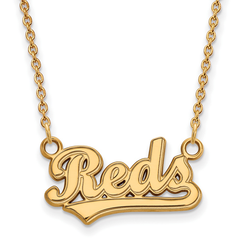 This small Cincinnati Reds script logo pendant necklace is made of polished 10k yellow gold. Pendant size: 12mm x 21mm. 10k yellow gold 18in cable chain with lobster clasp. Chain width: 1.95mm. Officially licensed MLB jewelry. Weight: 1.7 grams. Made in the USA.