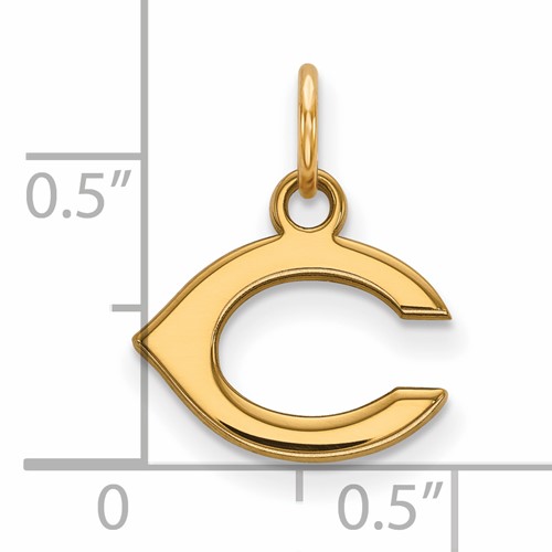 This tiny Cincinnati Reds C charm is made of polished 10k yellow gold. Item size: 10mm x 7mm. Officially licensed MLB jewelry. Fits up to a 3mm wide chain. Weight: 0.5 grams. Made in the USA.