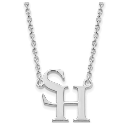 This Sam Houston University pendant with chain is made of polished 14k white gold. Pendant height: 3/4in, width: 3/4in. Chain length: 18in. Officially licensed jewelry. Weight: 2.3 grams. Made in the USA.