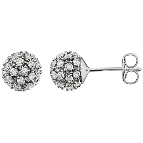 These 14kt white gold round cluster earrings feature 3/4 ct tw genuine diamonds. Earring dimensions: 7mm x 7mm. Diamond details: 62 round diamonds, H-I color, I3 clarity. Weight: 2.8 grams. Made in the USA.