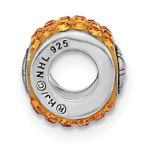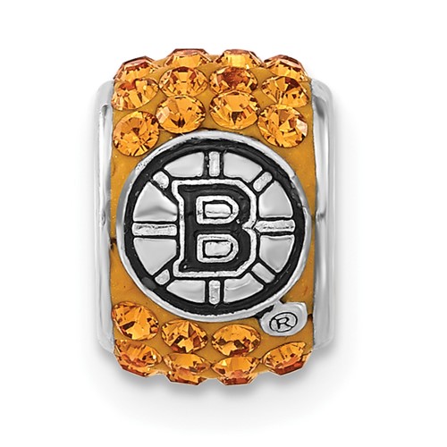 This barrel shaped Boston Bruins charm bead is made of sterling silver and ncrusted with gold crystals. On each side the Bruins' logo is sculpted in raised relief and highly polished which provides a striking contrast against the sparkling crystals. Fits all major modular bracelet brands. Charm is 3/8in in diameter with a 4mm opening. Packaged in black velvet presentation box. Import.