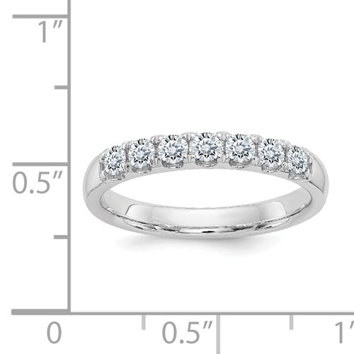1.5 ct Pure Light moissanite 7-stone ring is crafted in 14k white gold. 7 x 4mm round brilliant cut moissanite stones, 1.5 carat total diamond equivalent weight. Color E-F. Clarity: VS1-VS2. 6H silicon carbide. Ships with Pure Light moissanite certificate of authenticity and warranty card. Item weight: 4.0 grams. Import.