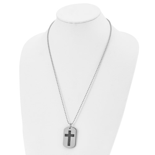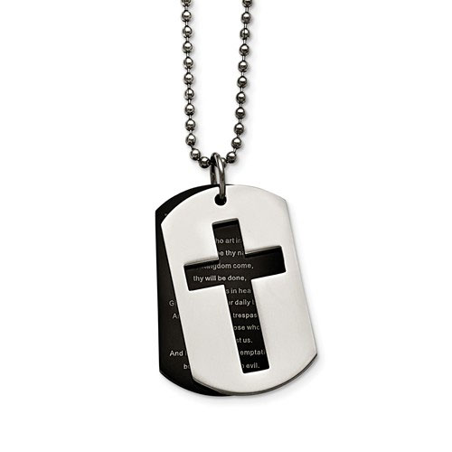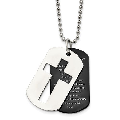 This two-piece Lord's prayer necklace is made of stainless steel. The Lord's prayer is engraved on a black-plated stainless steel dog tag. The second dog tag has a cut-out cross. 24-inch stainless steel bead chain has a fancy lobster clasp. Imported.