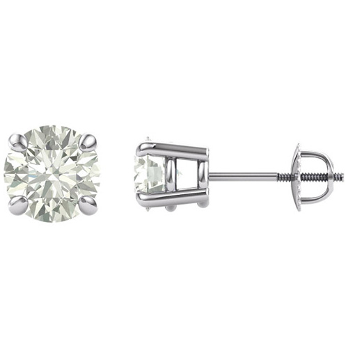 Each stud earring dazzles with one 7.5mm Forever One moissanite jewel set in polished 14k white gold. E-F color, VS1-VS2 clarity. Four-prong setting with screw backs. The equivalent diamond weight is 3.0 carat total weight for both earrings. Friction backs. Includes Charles & Colvard warranty card and certificate of authenticity. Made in the USA.