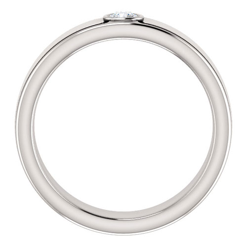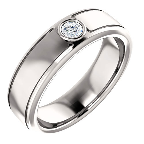 This men's 1/10 ct diamond bezel ring is made of 14k white gold. It has grooves along the rounded edges. Ring top width: 6mm, palm width: 2.5mm. Diamond details: 3mm round full cut diamond, SI2-SI3 clarity, G-H color. Average weight: 13.6 grams. Made in the USA.