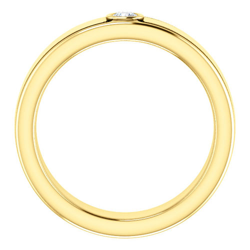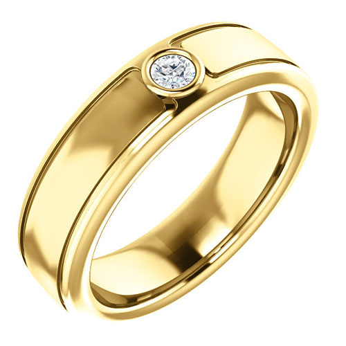 This men's 1/10 ct diamond bezel ring is made of 14k yellow gold. It has grooves along the rounded edges. Ring top width: 6mm, palm width: 2.5mm. Diamond details: 3mm round full cut diamond, SI2-SI3 clarity, G-H color. Average weight: 13.6 grams. Made in the USA.