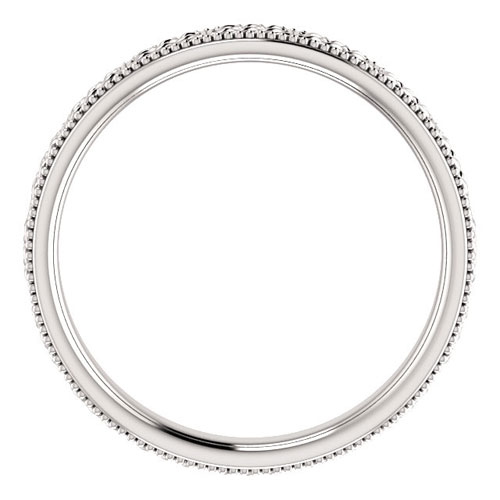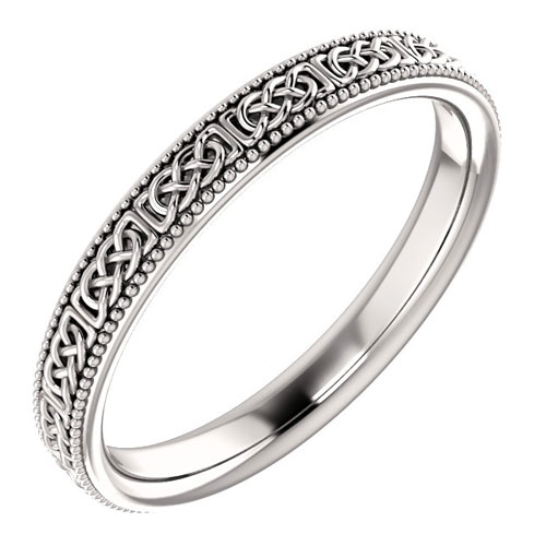 This slender 14k white gold Celtic wedding band has milgrain edges and a polished finish. Available in sizes 4-8, whole and half finger sizes only. Ring width: 3mm. Closed back and standard fit. Size 7 band weighs approximately 3.0 grams. Made in USA.