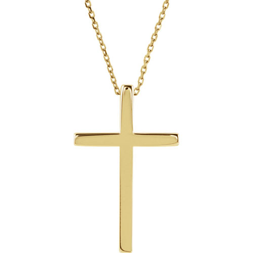 This classic latin cross necklace is made of solid 14k yellow gold and has a bright polished finish. 14k yellow gold 18in cable chain with spring ring clasp. Pendant size: 7/8in x 1/2in. Chain width: 1mm. Hidden bail. Item weight: 2.6 grams. Made in the USA.