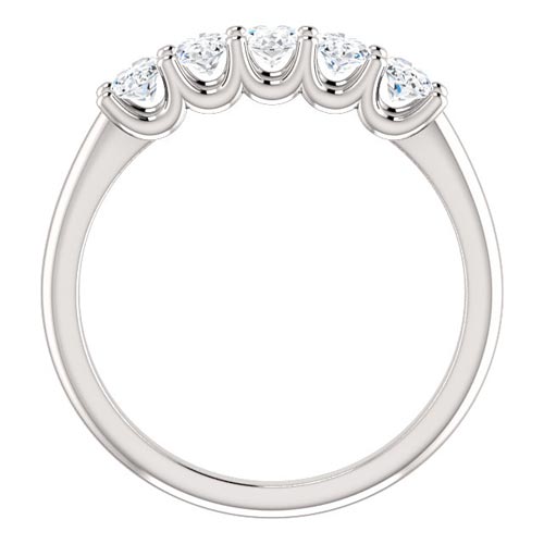 2.5 carat Forever One 5-stone oval moissanite anniversary ring is made of 14k white gold. Set with five matched 5mm x 3mm oval Forever One moissanite gemstones, E-F color and VS1-VS2 clarity. Shared U shaped prongs. Approximate weight: 2.6 grams. Standard fit. Diamond equivalent carat weights are used when describing the size of the moissanite stone. Includes Charles & Colvard certificate of authenticity and warranty card. Made in the USA.