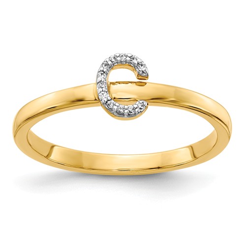 14k yellow gold diamond initial C ring has a polished finish. Ring top dimensions: 7mm x 5mm. Diamond details: .03 carat total weight, 12 round diamonds, I2 clarity, I-J color. Standard fit ring is rhodlum-plated. Average weight: 1.8 grams. Import.