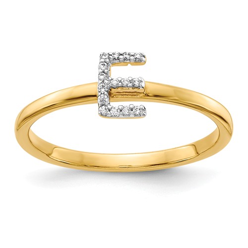 14k yellow gold diamond initial E ring has a polished finish. Ring top dimensions: 7mm x 5mm. Diamond details: .05 carat total weight, 15 round diamonds, I2 clarity, I-J color. Standard fit. Average weight: 1.6 grams. Import.