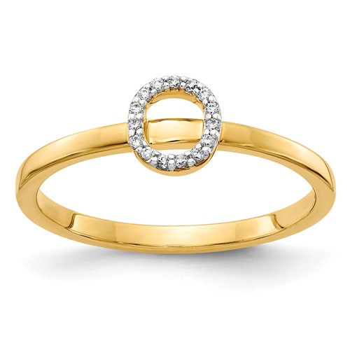 14k yellow gold diamond initial O ring has a polished finish. Ring top dimensions: 7mm x 4mm. Diamond details: .06 carat total weight, 15 round diamonds, I2 clarity, I-J color. Standard fit ring is rhodlum-plated. Average weight: 1.7 grams. Import.