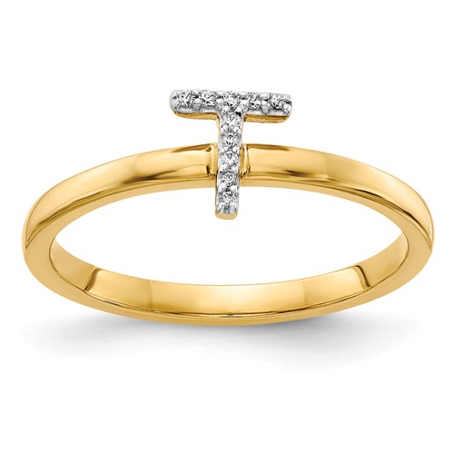 14k yellow gold diamond initial T ring has a polished finish. Ring top dimensions: 7mm x 5mm. Diamond details: .04 carat total weight, 10 round diamonds, I2 clarity, I-J color. Standard fit. Average weight: 1.9 grams. Import.