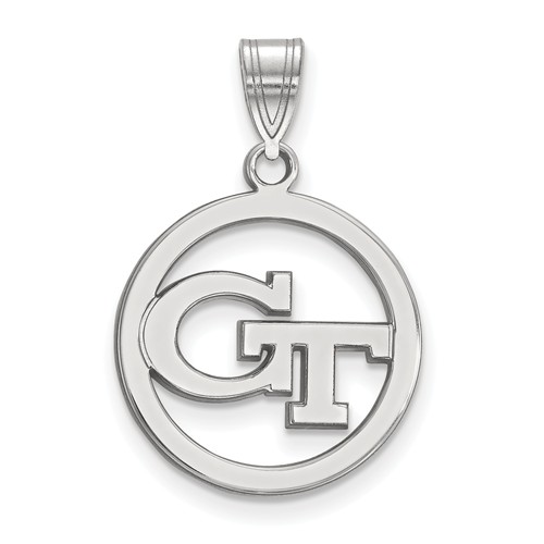 This small Georgia Tech circle pendant is made of polished sterling silver. Item height: 11/16in, width 11/16in. Officially licensed jewelry. Weight: 2.6 grams. Made in the USA. Fits up to a 3mm chain.