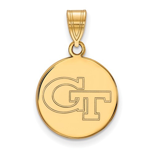 This Georgia Tech disc pendant is made of polished 14k yellow gold. Item length: 5/8in, width: 5/8in. Officially licensed jewelry. Weight: 2.1 grams. Made in the USA. Fits up to a 4mm chain.