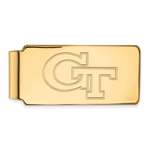 Georgia Tech money clip is made of 14k yellow gold. Laser-cut. Item length: 2in, width: 1in. Officially licensed jewelry. Weight: 20.3 grams. Made in the USA.