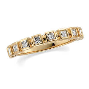 Polished 14kt yellow gold. Diamond anniversary band dazzles with eight .05CT square princess cut diamonds. Diamond color H-I, clarity SI2. Weighs 1.96 DWT (3.05 grams). Please note: weight is approximate, actual weight may vary.