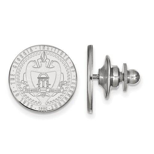 Georgia Tech lapel pin is made of polished 14k white gold. Item length: 5/8in, width: 5/8in. It has the school motto engraved in the middle. Officially licensed jewelry. Weight: 2.0 grams. Made in the USA.