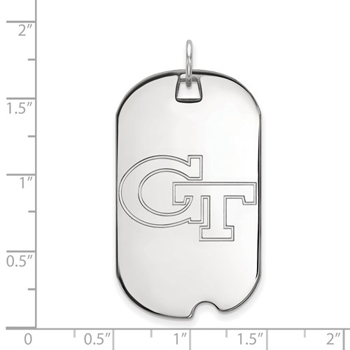 Georgia Tech GT large dog tag is made of polished 14k white gold. Item length: 40mm, width: 24mm. Officially licensed jewelry. Weight: 9.1 grams. Made in the USA. Fits up to a 3mm chain.