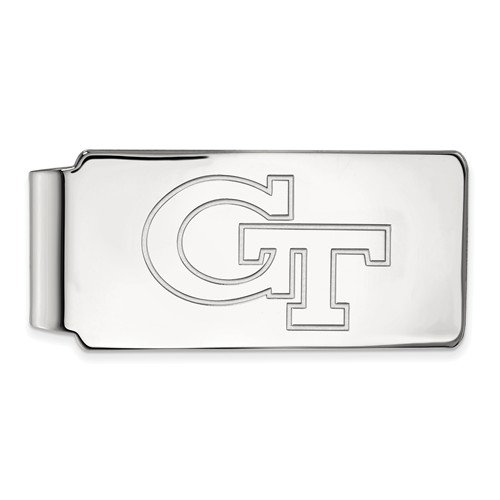 Georgia Tech money clip is made of 14k white gold. Laser-cut. Item length: 2in, width: 1in. Officially licensed jewelry. Weight: 20.3 grams. Made in the USA.