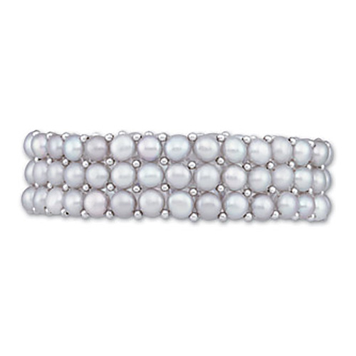 Three row silver grey button pearl stretch bracelet is made of sterling silver. Weighs 1.40 grams. It contains 6mm pearls.