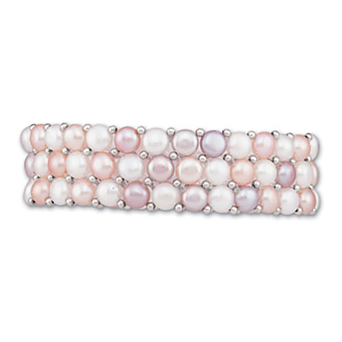 This sterling silver stretch bracelet has three rows of multi colored natural freshwater cultured peach button pearls. Weighs 1.40 grams. It contains 6mm pearls. One size fits most. Import.