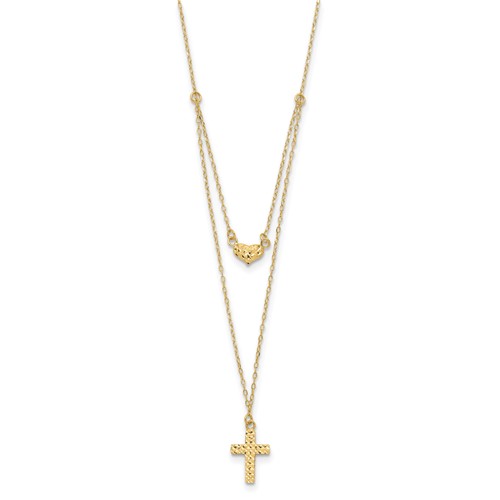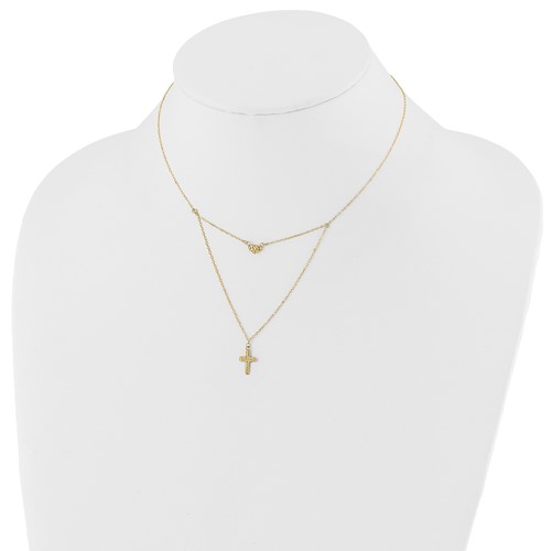 14k yellow gold heart and cross necklace has two strands. 14k yellow gold cable chain is 16 inches with 2 inch extension. Spring ring clasp. Cross length: 1/2in. Weight: 1.2 grams. Made in Indonesia.