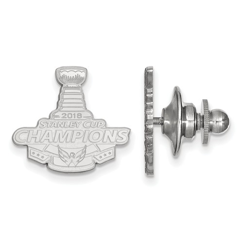 This Washington Capitals 2018 Stanley Cup champions lapel pin is made of polished sterling silver. Item length: 5/8in. Officially licensed jewelry. Weight: 3.1 grams. Made in the USA.