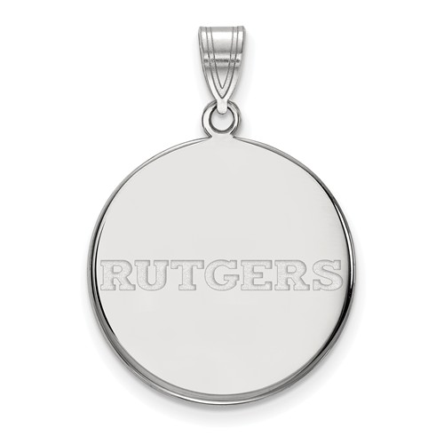 Rutgers University round pendant is made of polished sterling silver. Item height: 7/8in, width: 7/8in. Officially licensed jewelry. Weight: 4.4 grams. Made in the USA. Fits up to a 4mm chain.
