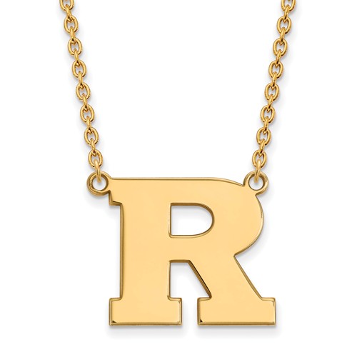 This Rutgers University R necklace is made of polished 14k yellow gold. Pendant height: 3/4in, width: 3/4in. 14k yellow gold cable chain length: 18in. Officially licensed jewelry. Weight: 3.4 grams. Made in the USA.