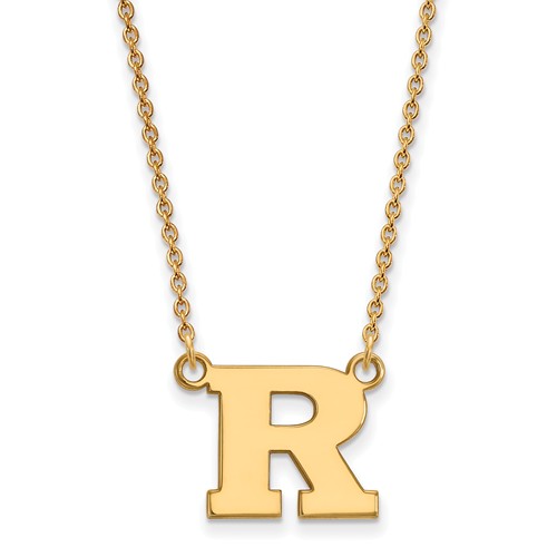 This small Rutgers University pendant with chain is made of polished 14k yellow gold. Pendant height: 1/2in, width: 1/2in. Chain length: 18in. Officially licensed jewelry. Weight: 1.6 grams. Made in the USA.
