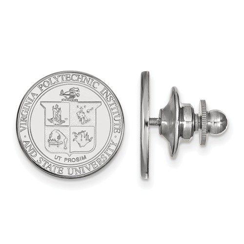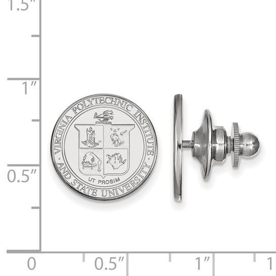 Virginia Tech lapel pin is made of polished sterling silver. Item length: 5/8in, width: 5/8in. It has the school motto engraved in the middle. Officially licensed jewelry. Weight: 3.1 grams. Made in the USA.