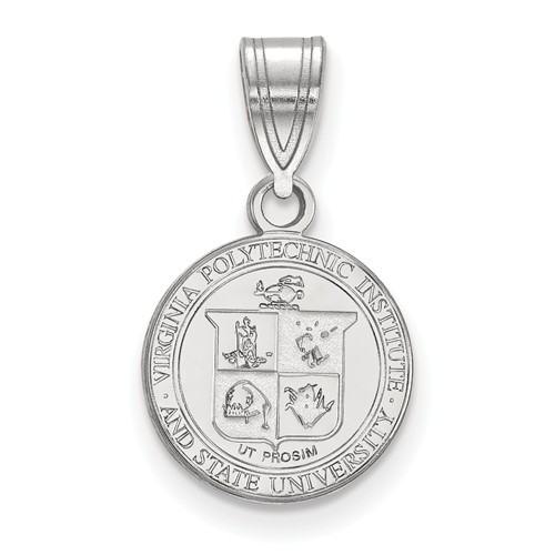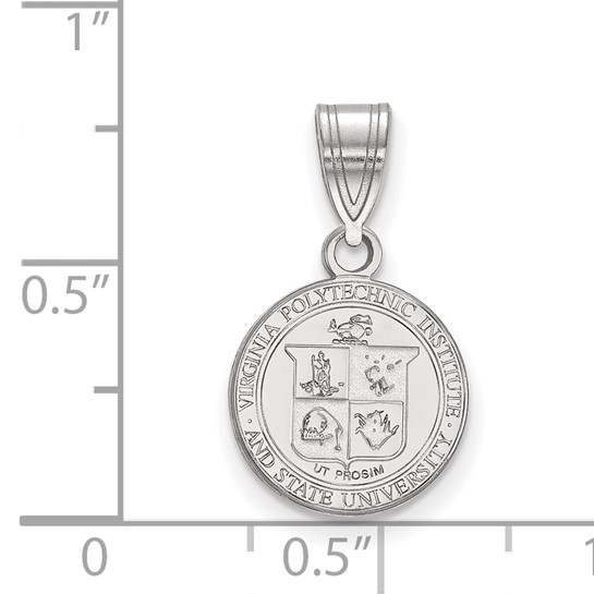 Virginia Tech crest pendant is made of polished sterling silver. Item height: 1/2in, width 1/2in. Officially licensed jewelry. Weight: 1.7 grams. Made in the USA. Fits up to a 3mm chain.