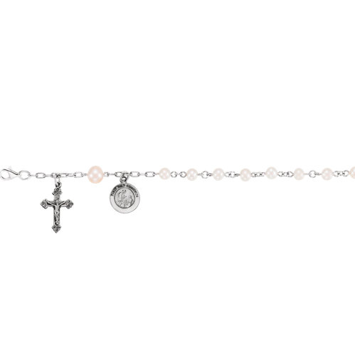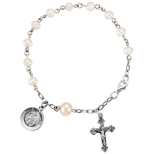 This sterling silver freshwater pearl rosary bracelet has a round first Holy Communion medal and cross charm. Lobster clasp. Length: 6in. Weight: 4.99 grams.