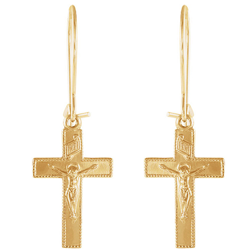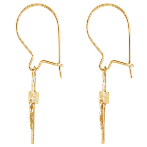 These 14kt yellow gold crucifix dangle earrings have ear wire backs. The cross is 14.00 mm by 9.00 mm. Total earring length: 25mm. Polished finish. Approximate weight: 0.62 grams. Made in USA. Available while supplies last.