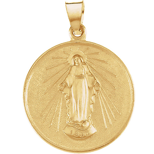 This round miraculous medal is made of solid 18k yellow gold. The back is blank. Dimensions: 24.5mm diameter; this item is the size of a quarter. The medal weighs approximately 6.43 grams. Bail is 5.5mm; we recommend a chain no wider than 4.5mm. Made in USA.
