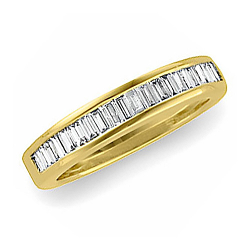 Polished 14k yellow gold diamond anniversary band contains 3/4 CT TW diamond baguettes. Diamond details: 2 x .032CT, 4 x .040CT, 8 x .033CT, 8 x .035CT straight baguettes. Weighs 2.82 DWT (4.39 grams). Please note: weight is approximate, actual weight may vary.