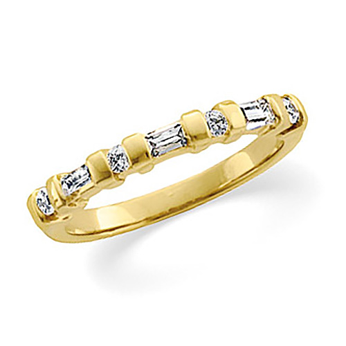 Polished 14kt yellow gold. Diamond details: 4 x .04CT round faceted full cut diamonds, 3 straight baguette diamonds, color GHI, clarity SI2/I1. Weighs 2.36 DWT (3.67 grams). Please note: weight is approximate, actual weight may vary.
