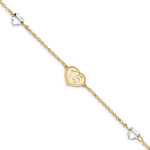 14k yellow gold Quinceanera charm bracelet has 14k white gold open heart charm accents. Main heart accent has the number 15 cut-out in the center. Bracelet length: 7in. Lobster clasp. Weight: 1.8 grams. Made in Italy.